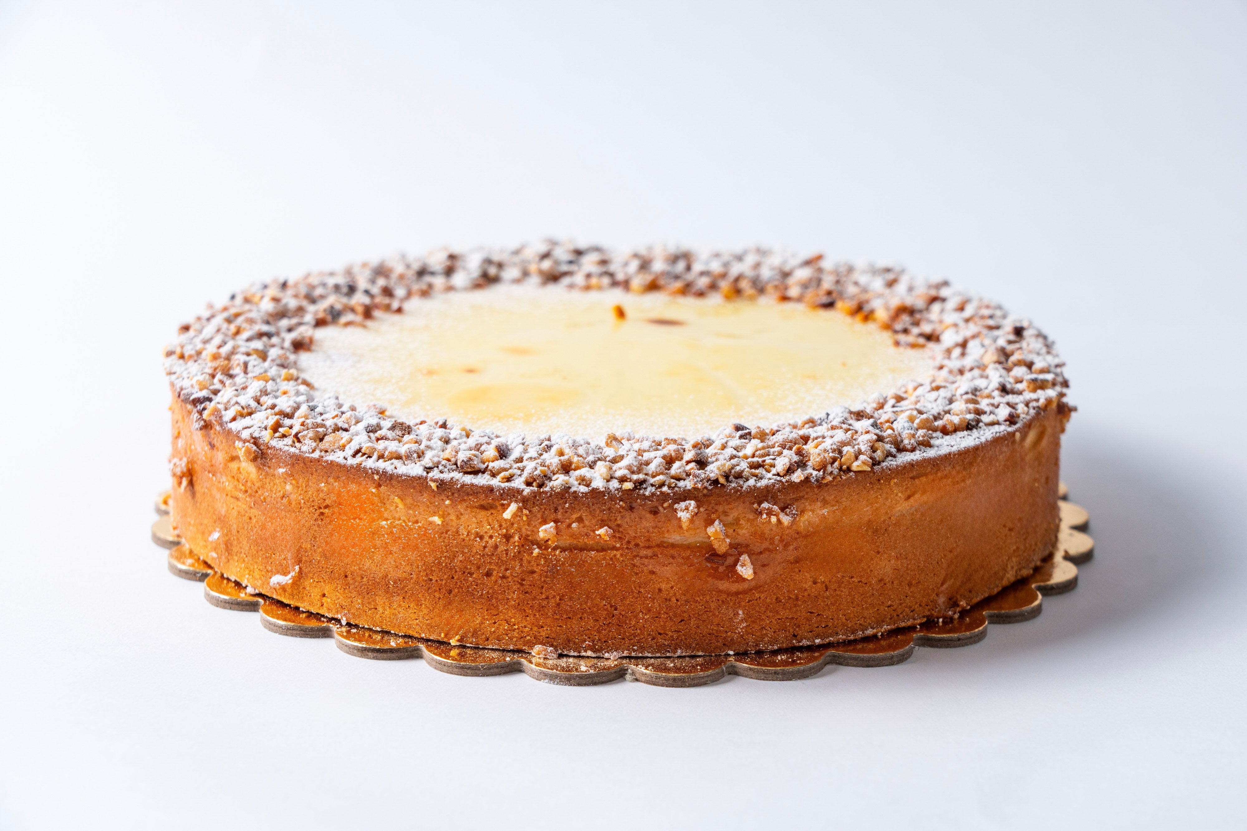 Our signature cake is made with a delicious shortcrust pastry filled with a smooth ricotta cheese mix topped with crushed praline