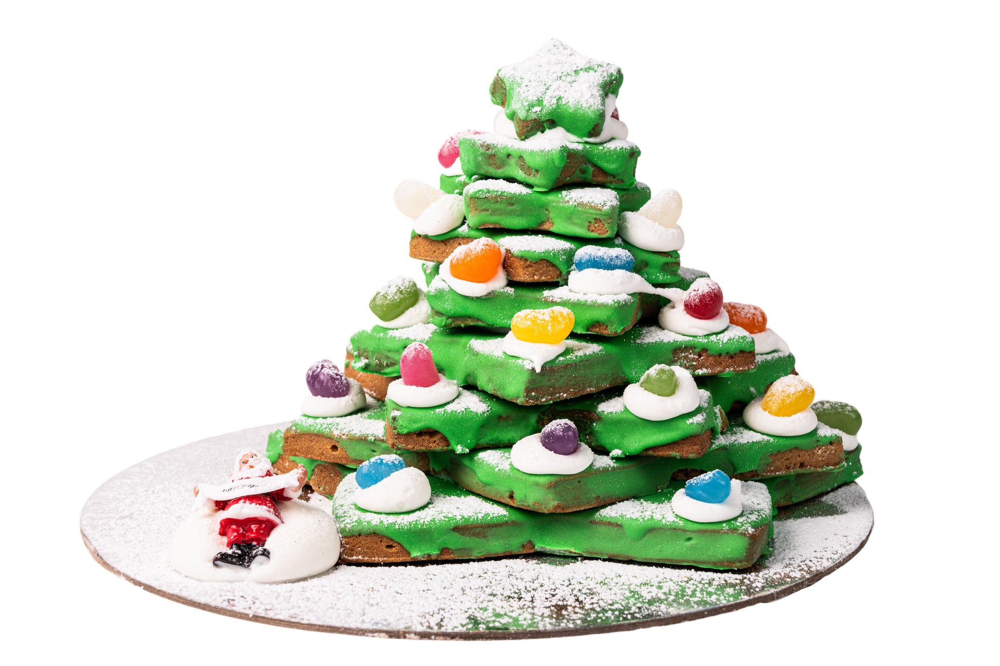 Made from gingerbread cookie dough and are assembled with green royal icing and decorated with colourful jellybeans